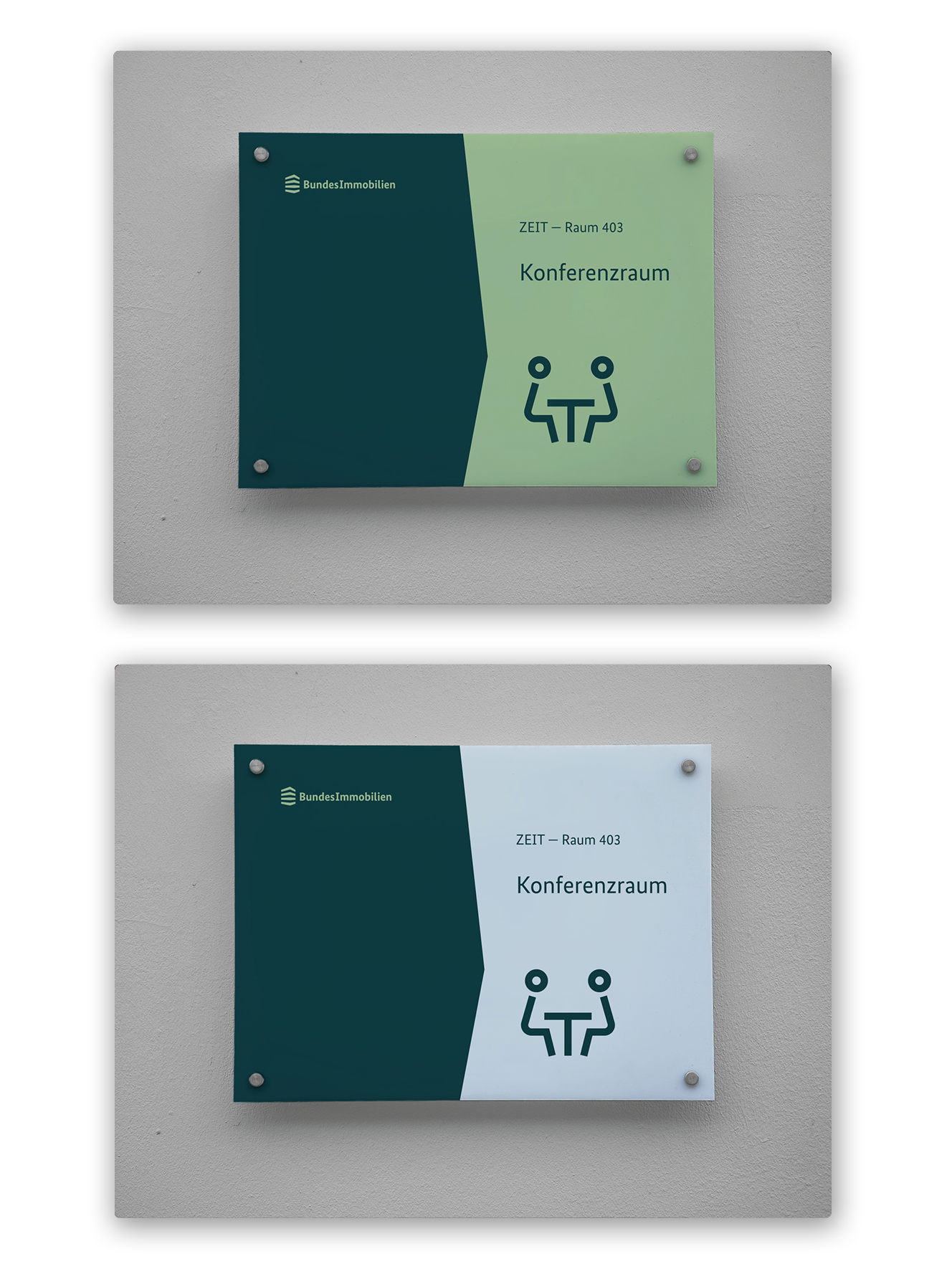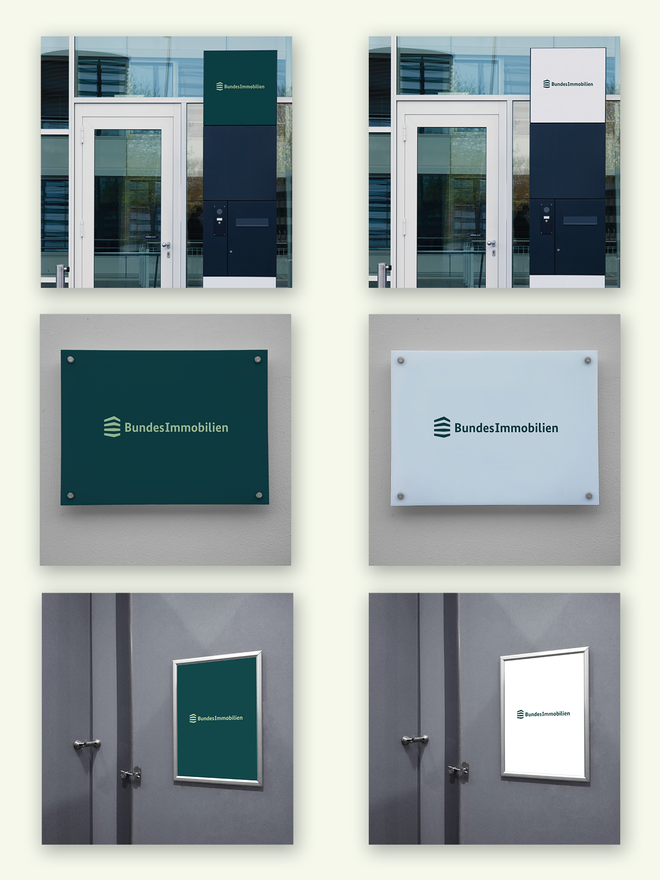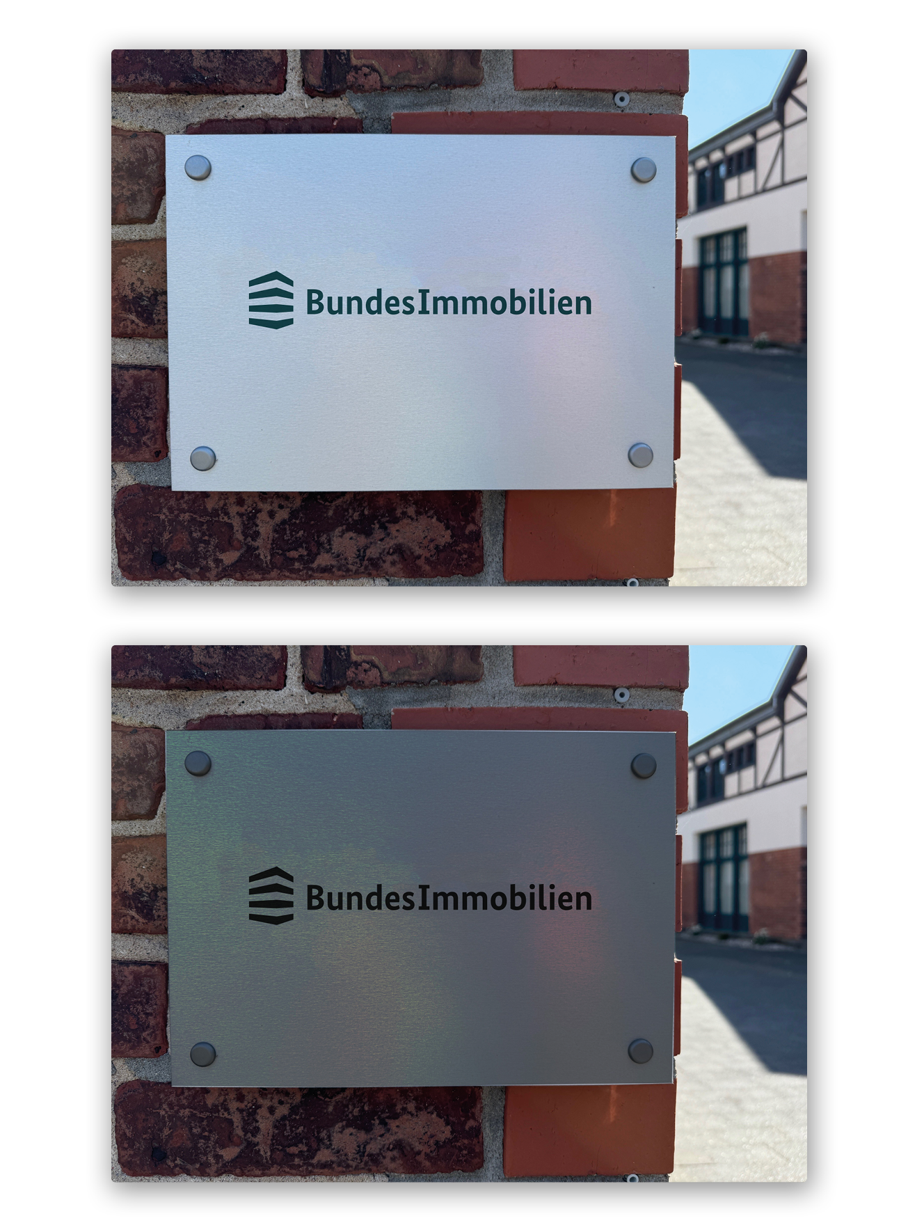 Handelt es sich um einen sehr hellen, weißlichen Metallton, ist ein Druck des dunkelgrünen BundesImmobilien-Signets empfehlenswert.