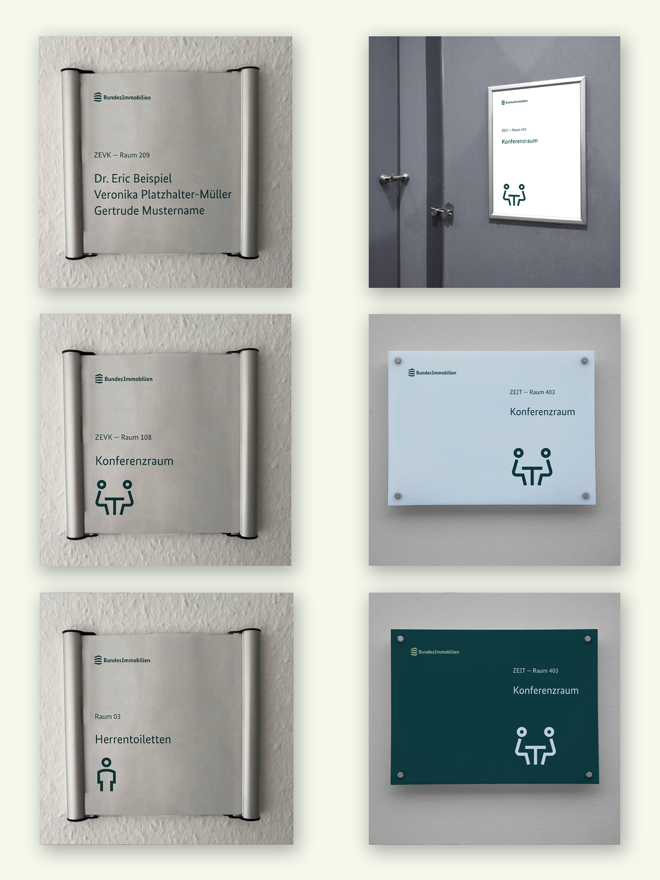 Die Beschilderung von Gebäuden, Räumen und Wegeleitsystemen in der BImA variiert stark in Format, Umfang und Material. Sie hängt vom jeweiligen Gebäude ab, in dem sich die BImA befindet. Deshalb finden Sie hier einige Anwendungsbeispiele, wie mögliche Gestaltungsvarianten im Rahmen