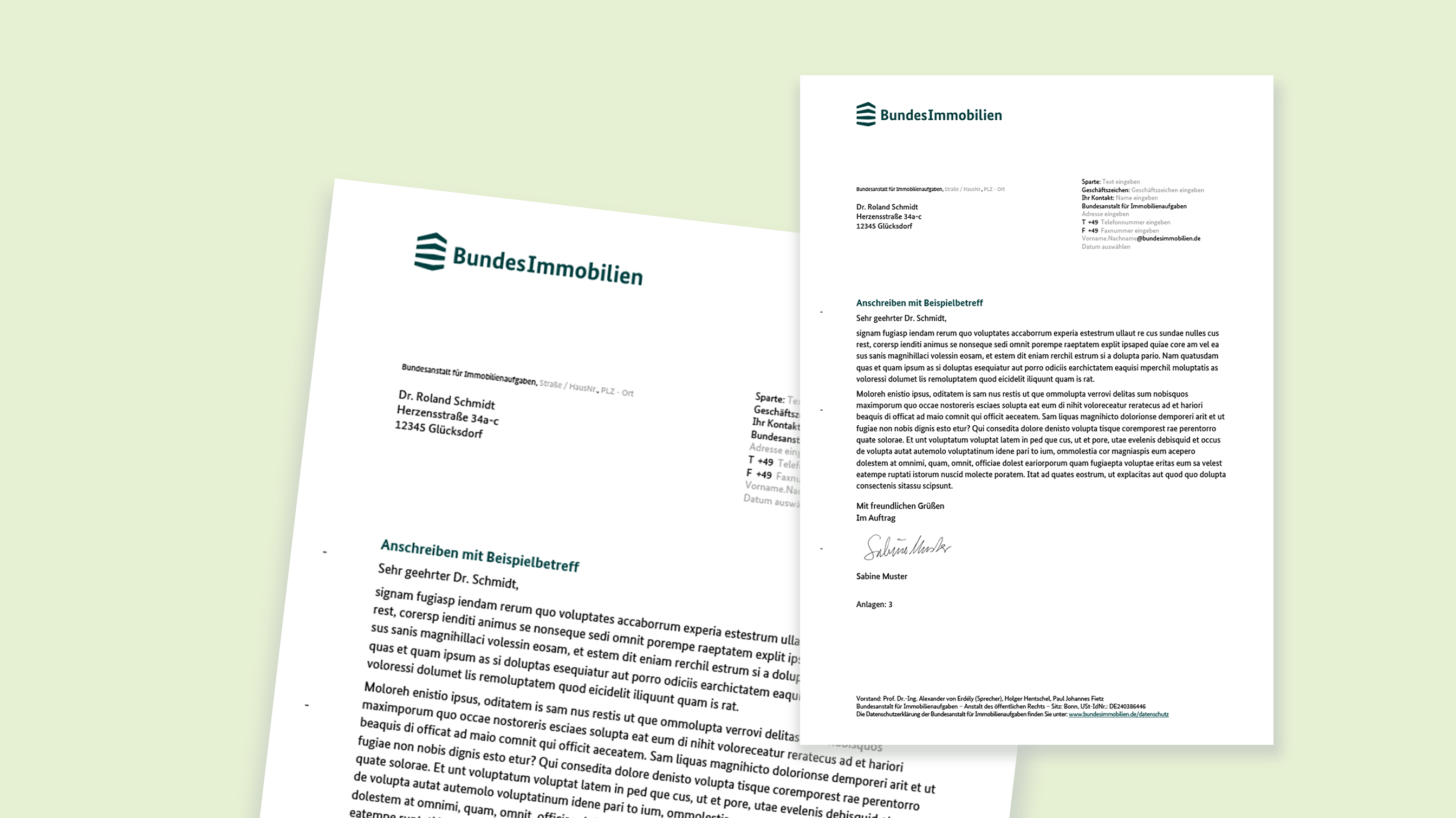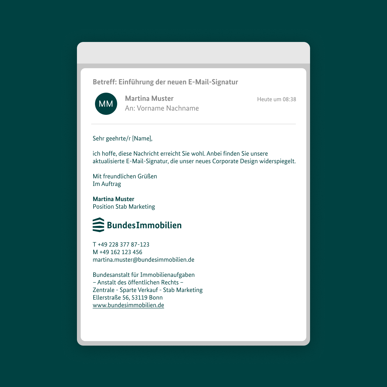 E-Mails der BImA werden mit der Schriftart Calibri in der Größe 11pt geschrieben. Grund dafür ist, dass unsere Hausschrift BundesSans auf den Geräten Dritter nicht installiert ist und durch eine andere Systemschrift ersetzt werden würde. Das kann zu Fehlern in der Darstellung führen.