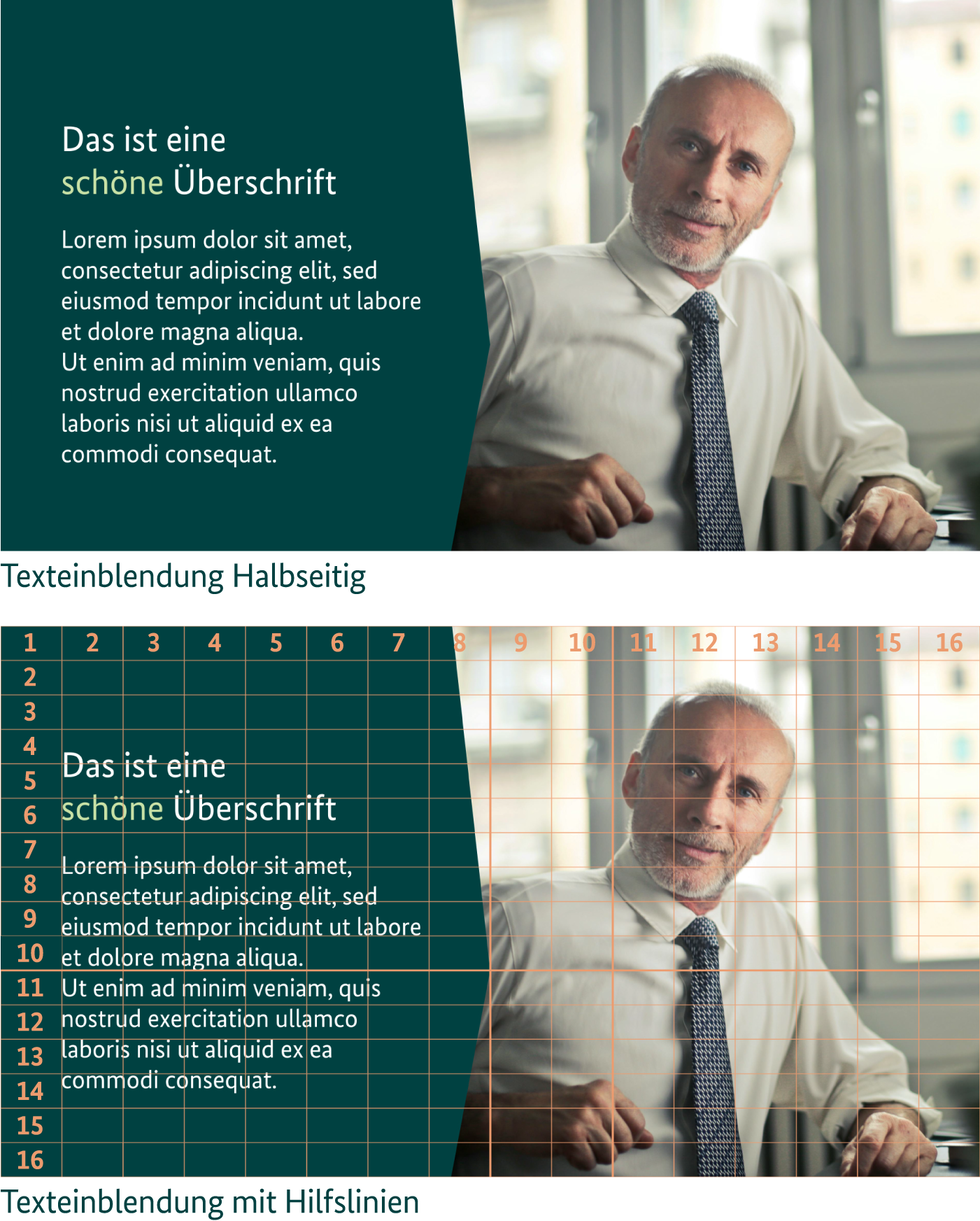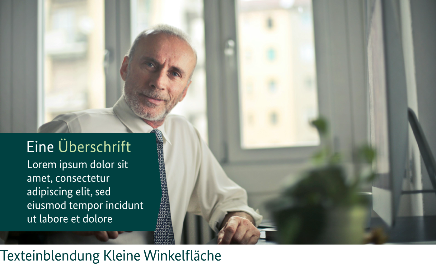 Texte werden auf einer dunkelgrünen Fläche eingeblendet. Die Standardtextfarbe ist weiß - wichtige Begriffe werden in Hellgrün gesetzt. Die angegebenen Schriftgrößen werden im Optimalfall beibehalten, können aber angepasst werden, solange die Lesbarkeit gewährleistet werden kann.